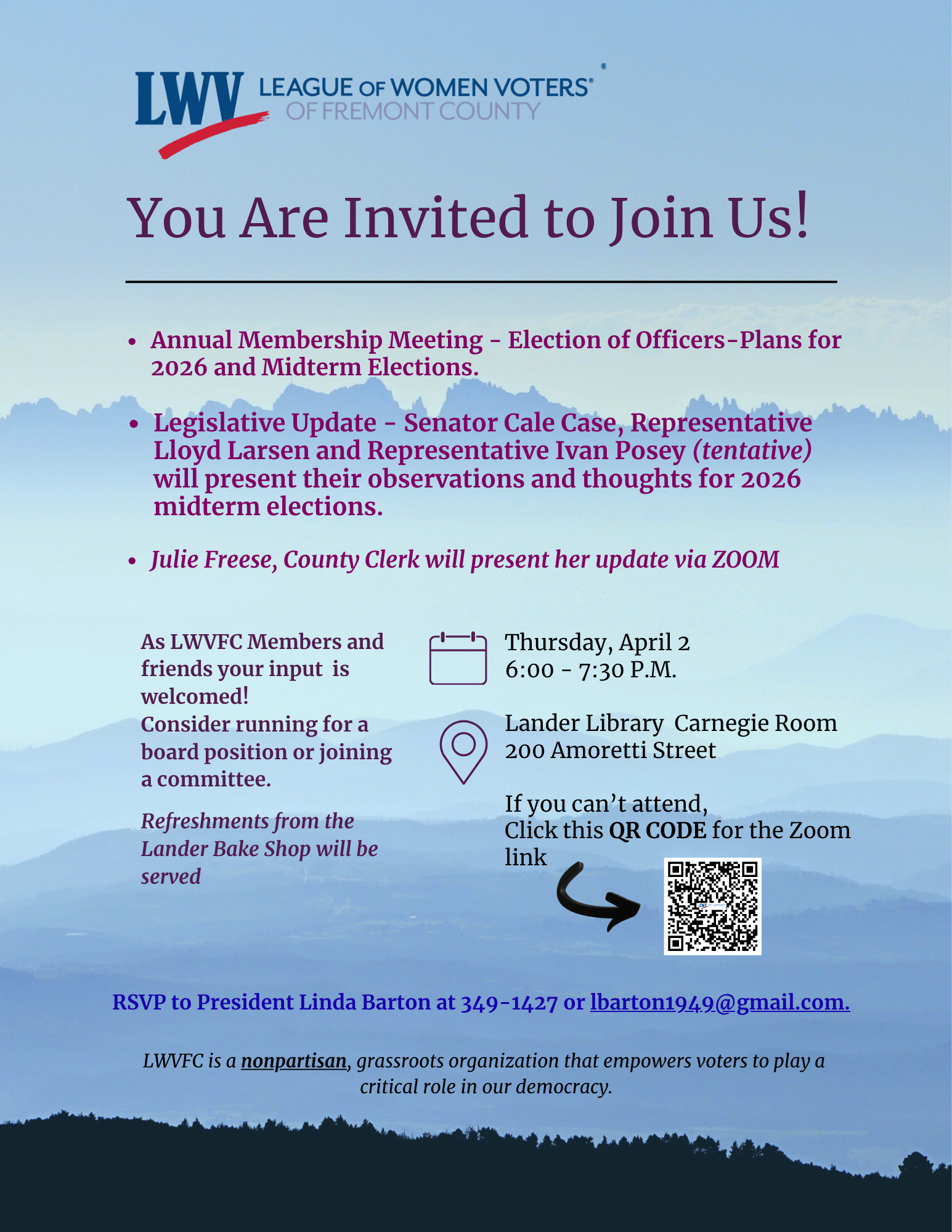 The League of Women Voters of Fremont County, Wyoming is a nonpartisan, grassroots organization that empowers voters to play a critical role in democracy.